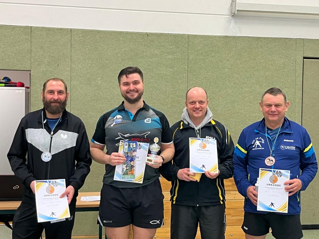 Am Sonntag bot sich allen Tischtennisverrückten die Möglichkeit den Weihnachtsspeck los zu werden. Die Freitaler Stadtmeisterschaften standen in Hainsberg auf dem Programm. Dabei waren alle Sportfreunde aus Freital und bei den Freitaler Vereinen gemeldeten Spieler herzlich eingeladen. Pünktlich um 9 Uhr eröffnete Martin Höhne vom gastgebenden SC Freital die inzwischen 20-igste Auflage der lokalen Titelkämpfe seit der Wende. Zu Beginn wurden die Meister der einzelnen Altersklassen ermittelt. Hierbei setzten sich größtenteils die Favoriten durch. Bei den Damen behielt Anja Täubner (TTC 49 Freital) souverän die Oberhand, während Simon Lawrenz (TTC Elbe Dresden) in der Altersklasse bis 30 Jahre Marco Huschmann (SG Oelsa) in die Schranken wies. Ein spannendes TTC-internes Finale lieferten sich in der Altersklasse 30 bis 45 Jahre Stephan Matthes und Daniel Tillig. Letzterer vermochte eine 10:7-Führung bei 2:1-Satzführung nicht ins Ziel zu bringen und musste sich seinem Mannschaftskameraden noch mit 2:3 geschlagen geben. In der Klasse 45 bis 60 Jahre gewann Rico Drechsler von der SG Freital-Weißig knapp vor den Sportfreunden Stefan Lochmann und Enrico Gessner (jeweils SC Freital). Tilo Tillig vom TTC 49 Freital wurde seiner Favoritenrolle in der Klasse über 60 Jahre gerecht und holte den Titel vor seinem Vereinskameraden Karl-Heinz Engelmann. Die Bestplatzierten der Altersklassen machten im Anschluss den Sieger aller Klassen aus. Anja Täubner ließ hier mit einem 3:2-Erfolg gegen den Hainsberger Favoriten Patrick Scheumann aufhorchen und erreichte das Viertelfinale. Hier war jedoch dann Endstation. Im Halbfinale standen mit Stephan Matthes, Tilo sowie Daniel Tillig gleich drei Akteure des TTC. Simon Lawrenz wollte die Phalanx jedoch durchbrechen. Stephan gewann sicher gegen Tillig Senior und zog verdient ins Finale ein. Daniel wollte sich für die Punktspielniederlage beim Wahl-Dresdner revanchieren, was bis zur 2:1-Satzführung auch gut funktionierte. Doch dann verließen ihn die Kräfte und er musste sich mit 2:3 geschlagen. Im Finale legte Stephan los wie die Feuerwehr und holte sich den ersten Durchgang mit durchschlagenden Topspin-Salven. Nun machte sich jedoch die Konstanz des ehemaligen Hainsbergers bemerkbar. Simon gewann nach gutem Spiel mit 3:1 und holte sich verdient den Titel des Freitaler Stadtmeisters. Herzlichen Glückwunsch dazu!