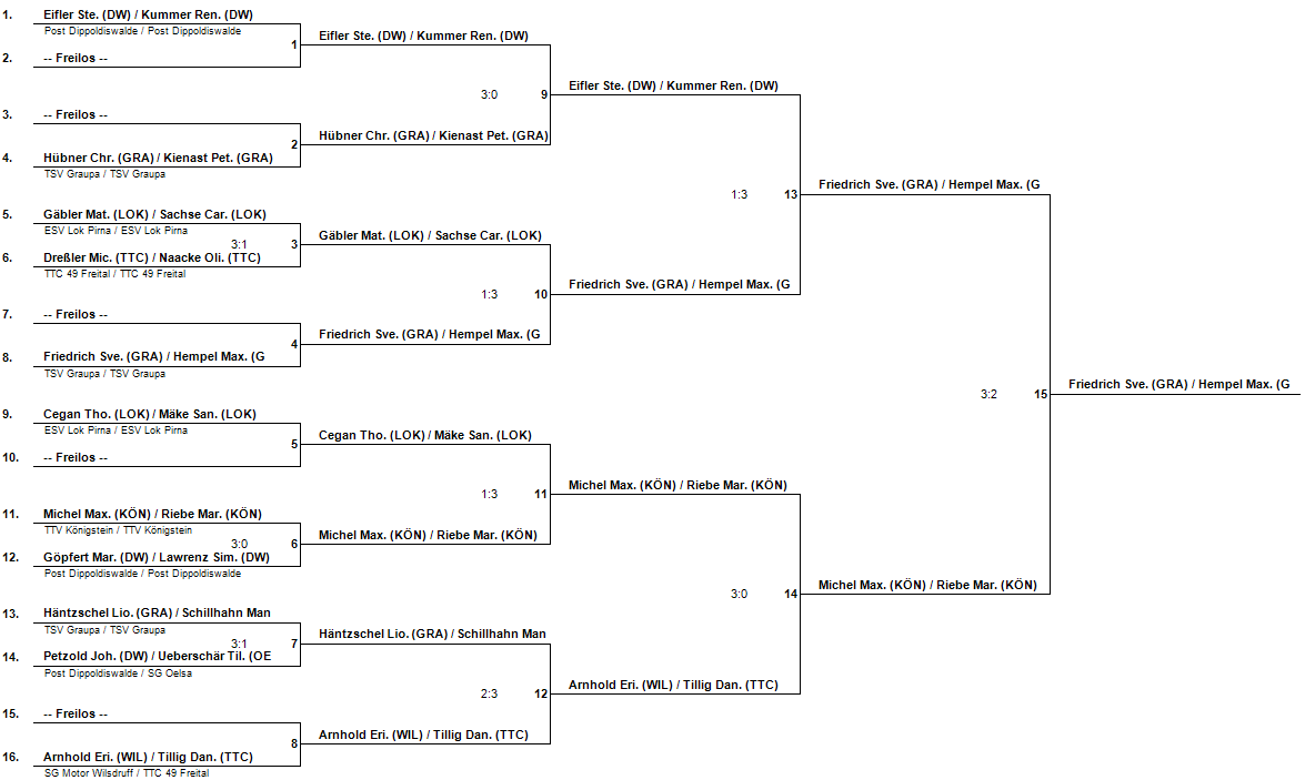 Nach den Gruppenspielen ging es in die Doppelkonkurrenz. Micha/Oli kamen nur schlecht in ihre Partien und mussten bereits früh die Segel streichen. Daniel und sein Wilsdruffer Partner taten sich ebenfalls schwer, konnten aber etwas glücklich noch mit 14:12 im fünften Durchgang ins Halbfinale einziehen. Hier war dann allerdings Endstation. Ein klares 0:3 besiegelte das Aus. Dennoch konnte die Bronzemedaille gewonnen werden. In der B-Klasse musste sich das Nachwuchsdoppel Philipp/Marco ebenfalls früh geschlagen geben. Stefan hatte mit Knut Rittner einen guten Partner gewinnen können. Ein knapper 3:2-Erfolg im Viertelfinale sicherte ebenfalls die Bronzemedaille. Doch auch hier war im Halbfinale Schluss. Eine 1:3-Niederlage besiegelte das Aus.